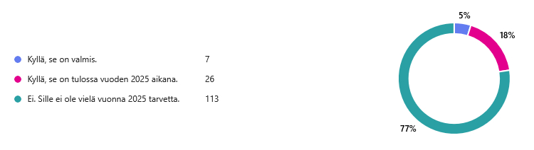 Vastauksia annettiin 146 kappaletta ja vuoden maaliskuussa 2025 vastuullisuusraportin olivat saaneet valmiiksi 7 yritystä ja vuoden loppuun mennessä 26 yritystä tulee saamaan sen valmiiksi. Tulemme tekemään samaisen kyselyn uudelleen maaliskuussa vuonna 2026.